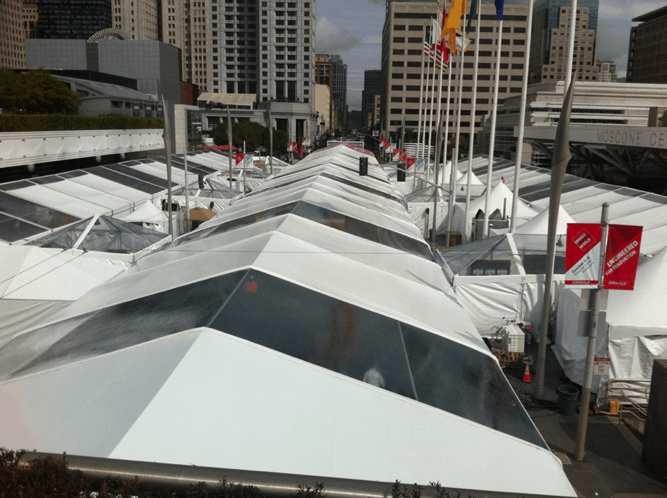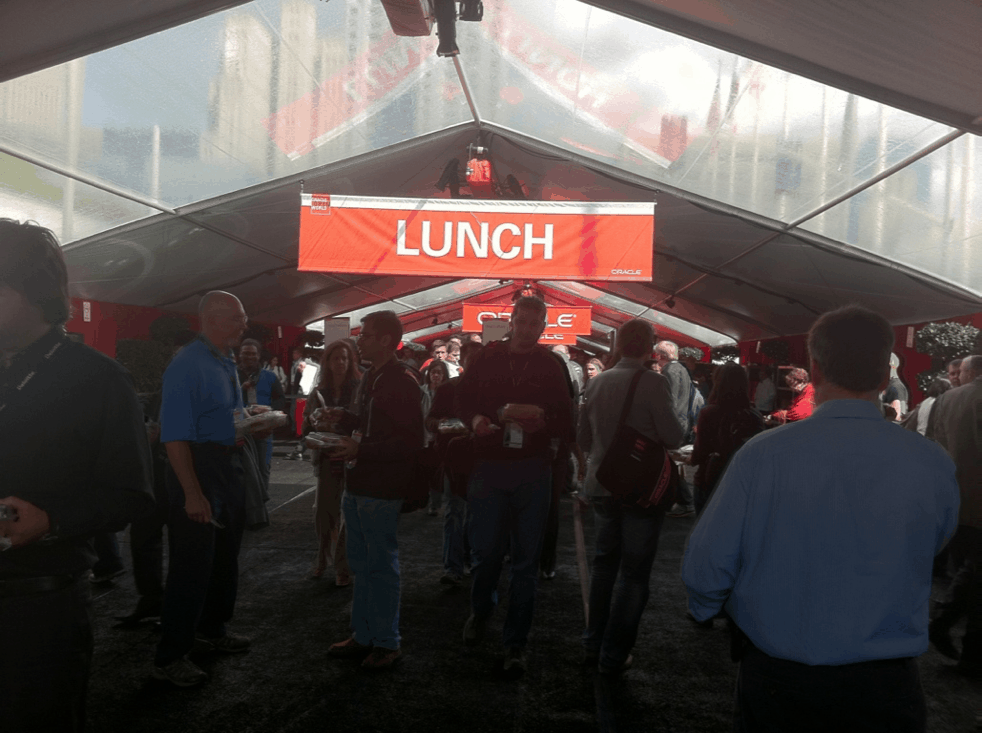 Podemos ver a grandiosidade deste evento no momento da refeição. Uma rua separa o prédio Moscone North do Moscone South. Essa rua é chamada de Howard Street.