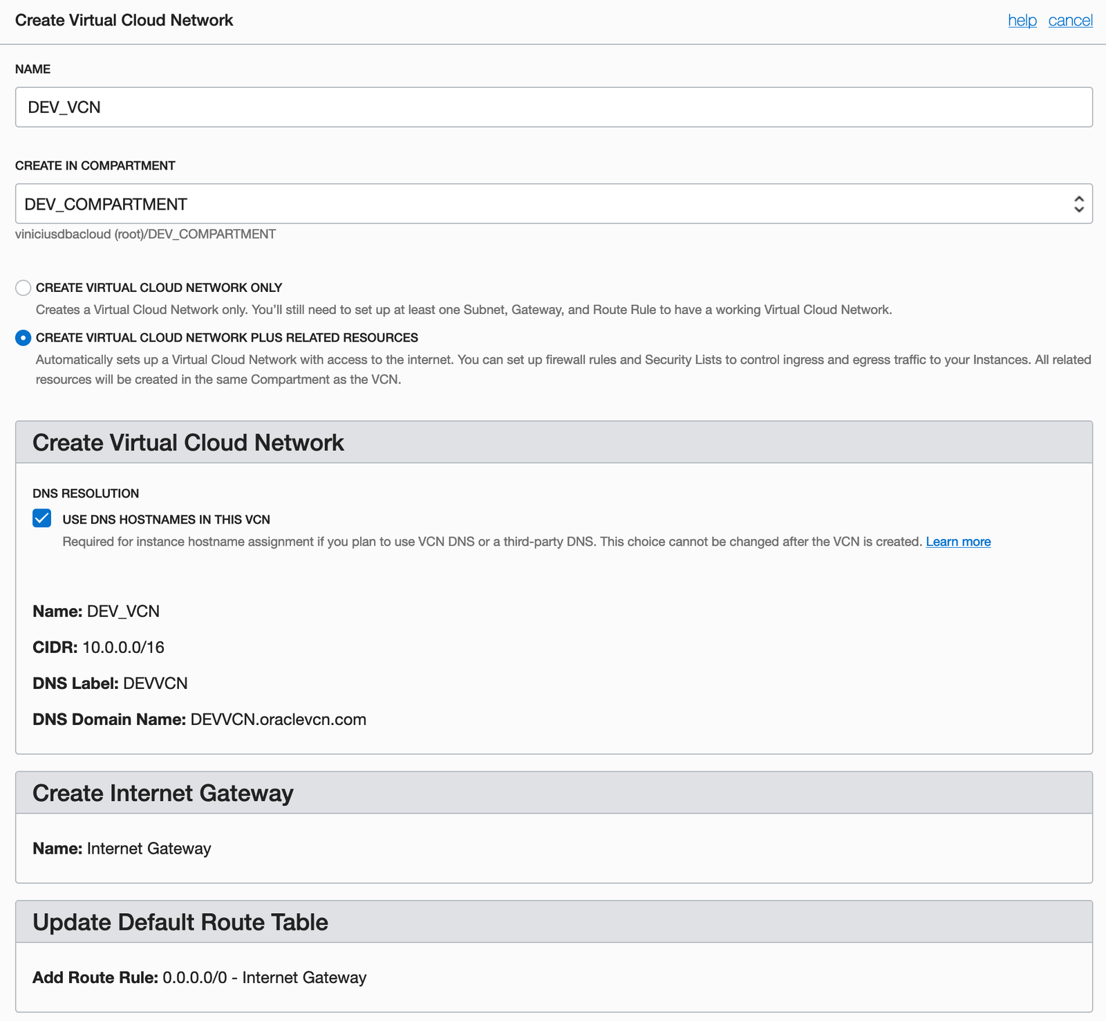 You should define a name for your VCN and the compartment that you want to create the VCN. It’s important to select the newly created compartment. You also should select between two options: create the VCN only or create the VCN plus related resources (security lists, gateways, route tables, subnets). This last option is the best option because you will save some time here. You also can keep the option DNS Resolution selected. After that, click on [Create Virtual Cloud Network] button: