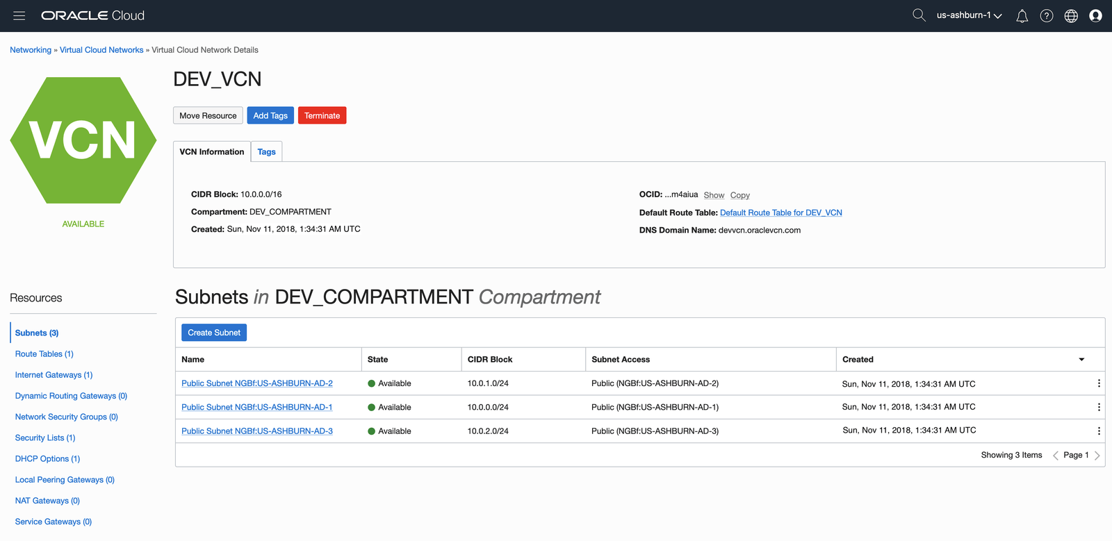 The new VCN, DEV_VCN, was created. We can see in the below screen that we have 3 public subnets, one for each AD for our region: