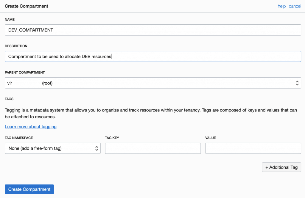 The creation Compartment screen it will be exhibited. You need to input a Compartment Name and a Description. Just as an information, this Compartment it will be created considering the root compartment as parent. This is normal. You can click on [Create Compartment] button: