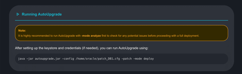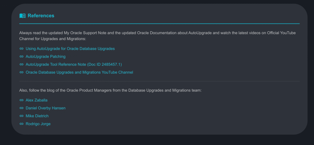 - Using AutoUpgrade for Oracle Database Upgrades: link to official documentation about AutoUpgrade.