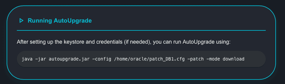 [oracle@upgrade-lab ~]$ cat download1.cfg # Created by AutoUpgrade Composer # Patch, ExecMode: Download global.global_log_dir=/home/oracle/autoupgrade-patching/log global.keystore=/home/oracle/autoupgrade/keystore download1.log_dir=/home/oracle/autoupgrade/download1/log download1.folder=/u01/software download1.patch=RU:19.25,OJVM,OPATCH,DPBP,OCW download1.platform=LINUX.X64