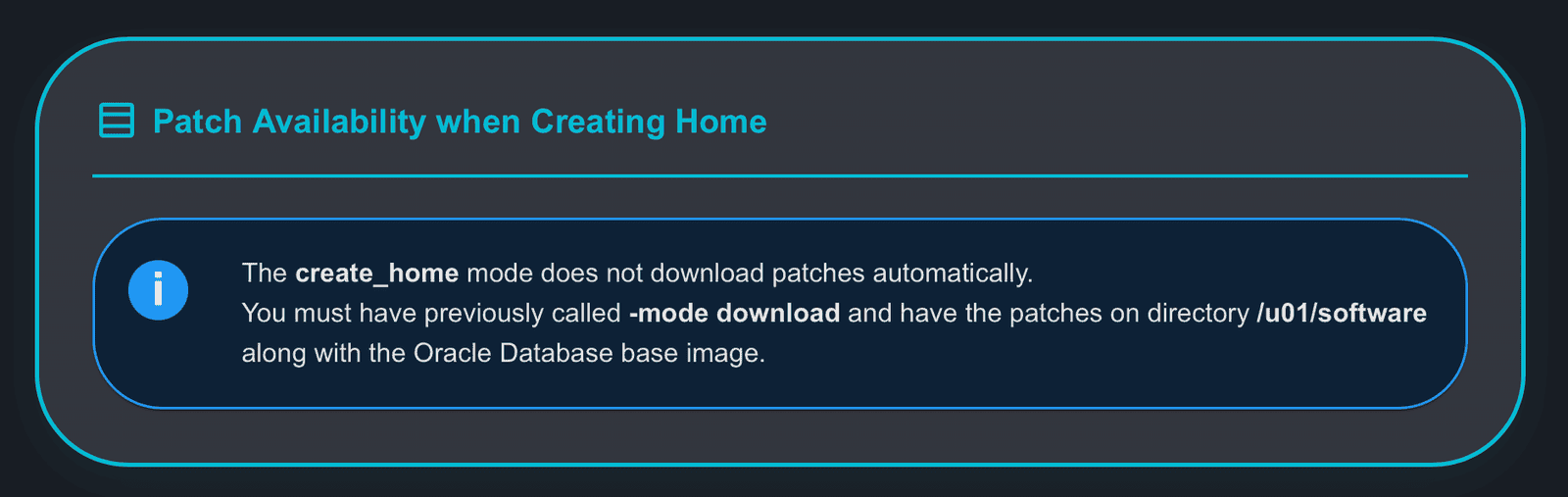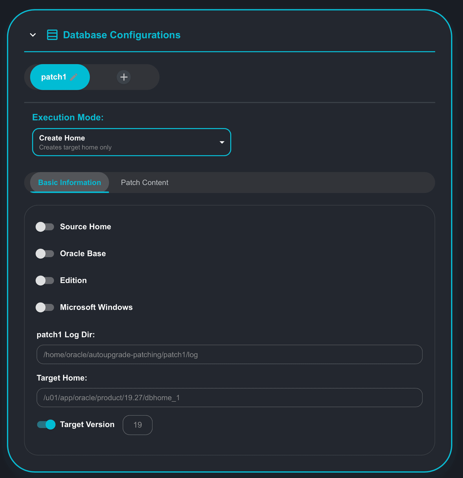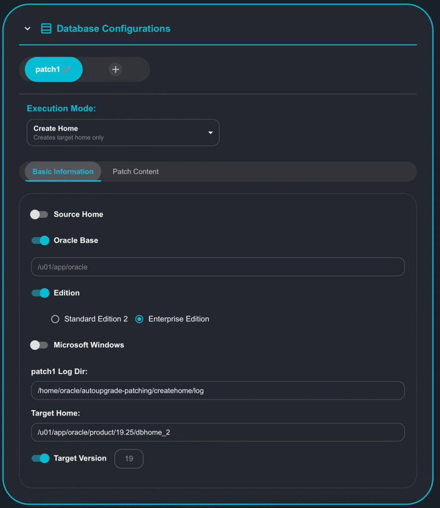 [oracle@upgrade-lab ~]$ cat createhome.cfg # Created by AutoUpgrade Composer # Patch, ExecMode: CreateHome global.global_log_dir=/home/oracle/autoupgrade-patching/log patch1.log_dir=/home/oracle/autoupgrade-patching/createhome/log patch1.folder=/u01/software patch1.patch=RU:19.25,OJVM,OPATCH,DPBP,OCW patch1.target_version=19 patch1.target_home=/u01/app/oracle/product/19.25/dbhome_2 patch1.home_settings.edition=ee patch1.home_settings.oracle_base=/u01/app/oracle