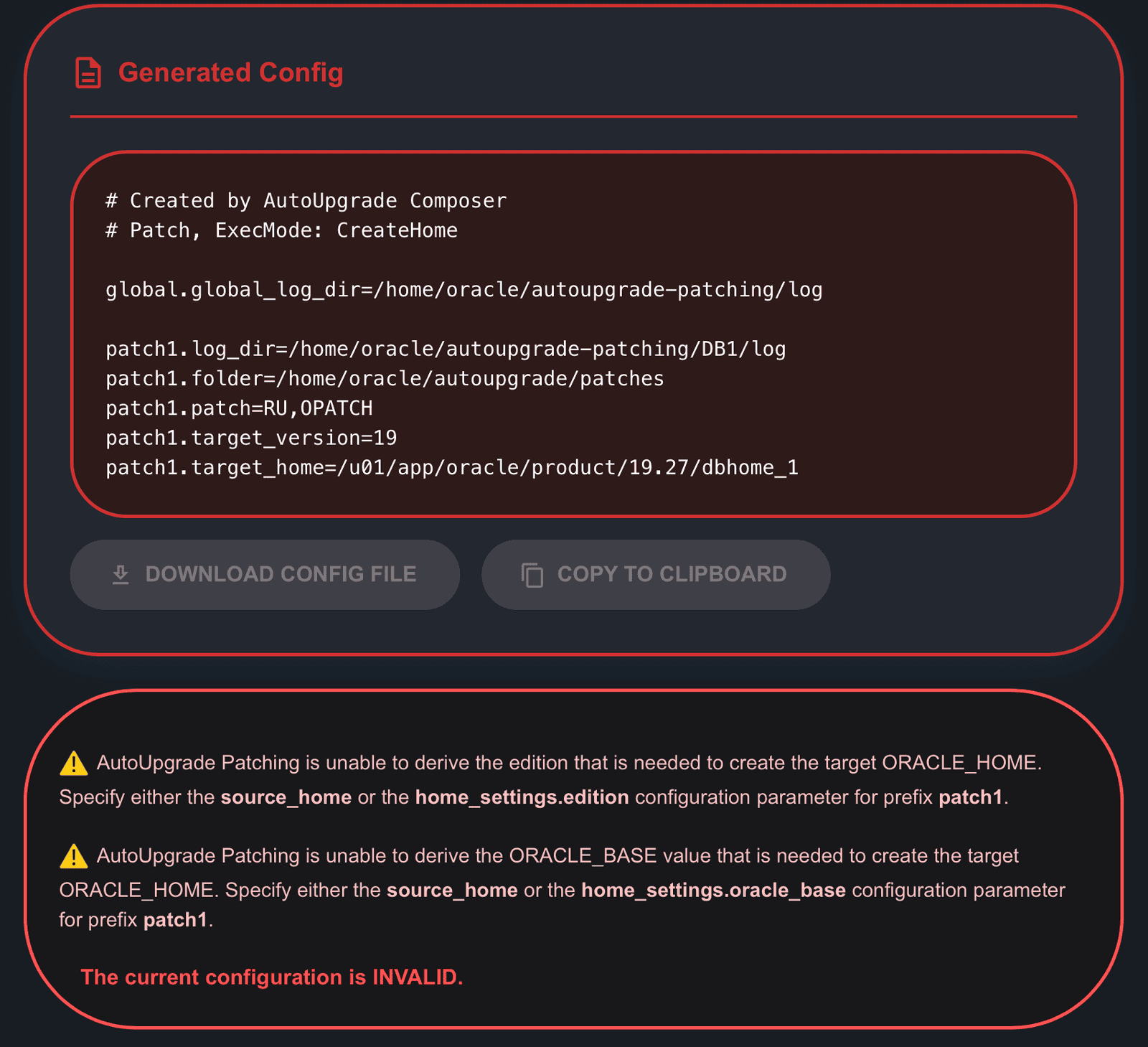 AutoUpgrade Patching is unable to derive the ORACLE_BASE value that is needed to create the target ORACLE_HOME. Specify either the source_home or the home_settings.oracle_base configuration parameter for prefix patch1.