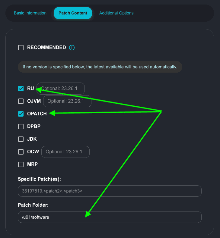 In my example, I am choosing a folder to store my patches after they are downloaded: /u01/software, because this was the folder where I downloaded the files in my last blog post. Make sure you select a folder where your patch files are present and that the user running AutoUpgrade has the right permissions to read the files.