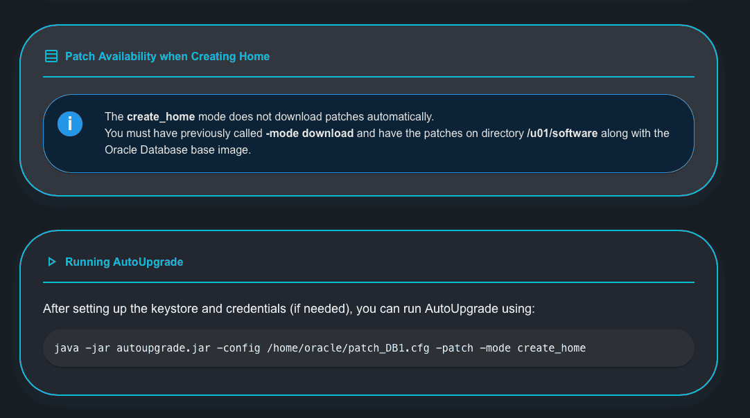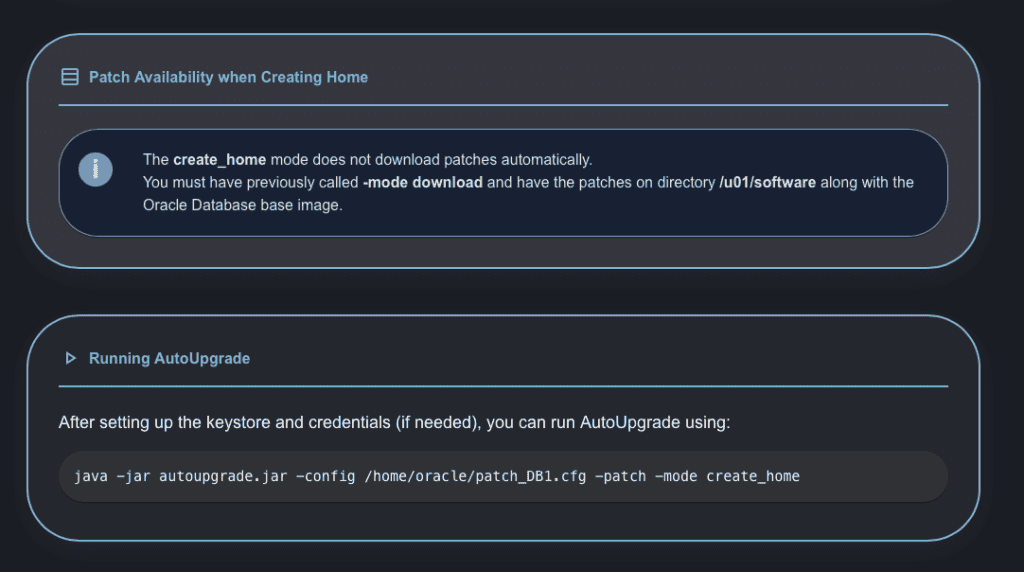 Continuing with the scroll, you have the instructions on how to run AutoUpgrade in Create Home mode. Notice that during the Create Home mode, AutoUpgrade will not download the patch files, so you need to download them before using the Create Home mode: